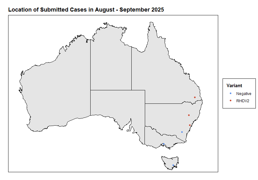 Location of submitted cases for calicivirus testing between August and September 2025. 73% of samples tested positive for RHDV2. |