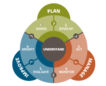 In adaptive management, you first plan (define the problem and know your target; assess and understand the problem; develop a plan and set clear objectives), then manage (choose control techniques and strategies; monitor the outcomes) and improve (evaluate and modify as required). |