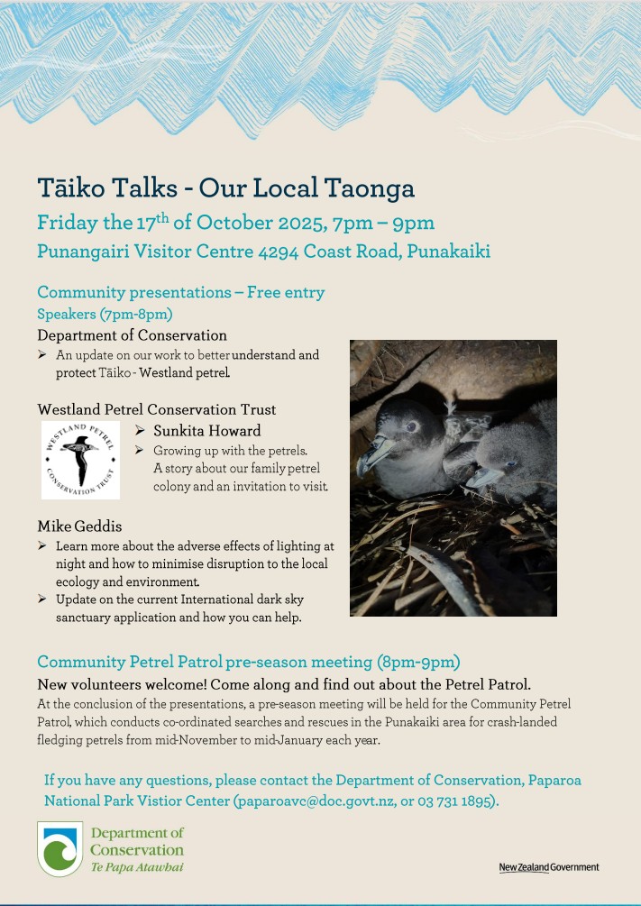 Here is a wonderful opportunity to find out about the latest research and work to protect Westland petrels or tāiko. DOC's Project Lead Biodiversity, Kate Simister, will provide updates, Sunkita Howard will share her story about growing up with the petrels, and Mike Geddis will explain the adverse effects of lighting, how to minimise risk to petrels and he will provide an update on the application for the area to be an international dark sky sanctuary.