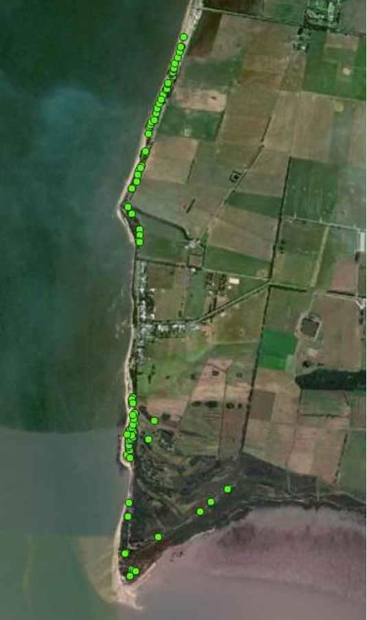Green dots indicate active rabbit warrens from Stockyard Point in the south, along the foreshore to Lang Lang Caravan Park in the north. |