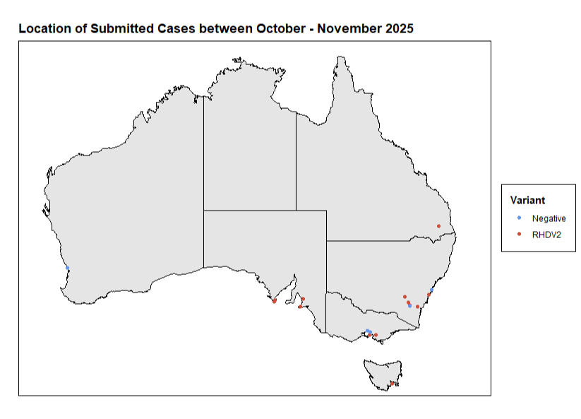 | Location of submitted cases for calicivirus testing in October and November 2025. 65% of samples tested positive for RHDV2. |