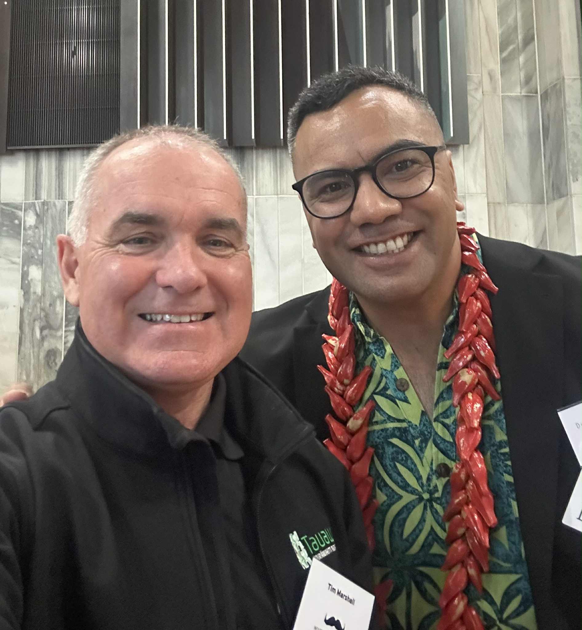 Oka (R) with Tim Marshall KSM (L) from Tauawhi Men's Centre at the report presentation. |