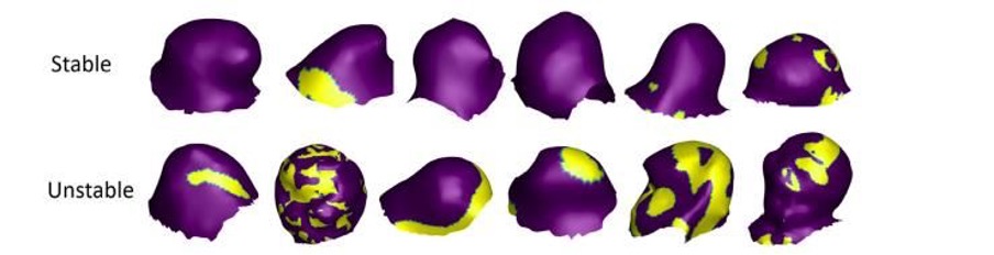 Yellow areas show stress hotspots on the aneurysm wall – regions where blood flow changes most dramatically. These zones were significantly larger in growing aneurysms (bottom) compared to stable ones (top), suggesting a strong link between abnormal flow patterns and aneurysm progression. |