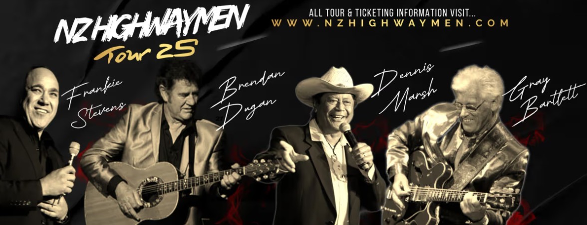 The NZ Highwaymen, are embarking on their Tour 25. After two sold out tours in 2023 and 2024, these legendary musicians are ready to once again captivate audiences with their timeless music. Brendan Dugan, Gray Bartlett, Dennis Marsh, and Frankie Stevens, collectively known as the "New Zealand Highwaymen" are coming to Upper Hutt Cossie Club with a special 'Monday Matinee'. You can go to lunch and then enjoy the show at 2:30pm on Monday 26th of May. Price $85 per person – including lunch.